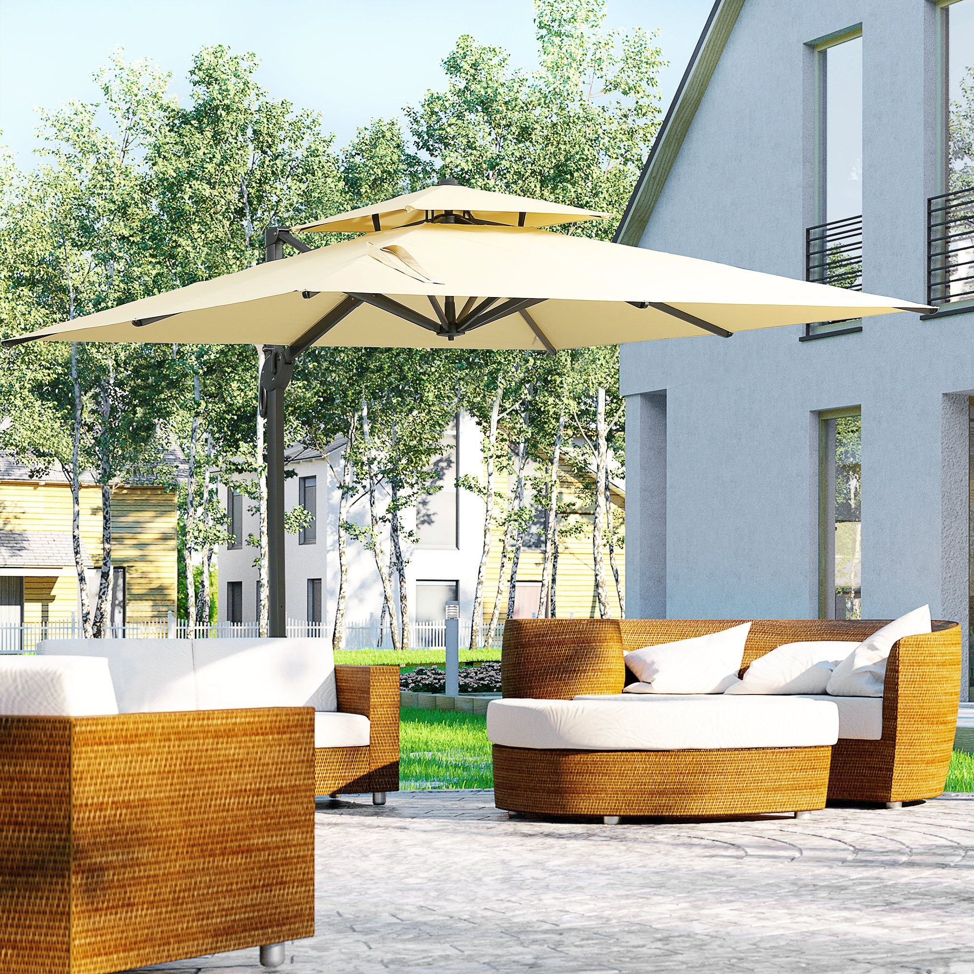 Offset Patio Umbrella with Base: Provide comfortable shade even in difficult situations. Our offset patio umbrella can cover large outdoor furniture that doesn't have a hole to mount a standard patio umbrella, and its double-top design allows airflow.