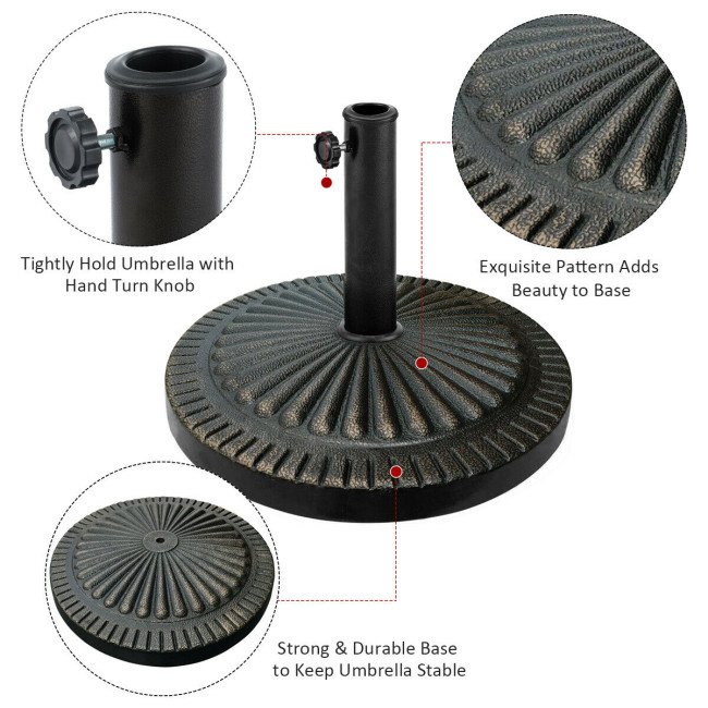 Whether it's rainy or windy, our umbrella base will stand in place to stabilize your umbrellas with superior quality. Constructed of high-quality resin and stainless accessories, our umbrella base is aging resistant and durable enough to withstand any weather conditions. It can be placed anywhere, such as gardens, patios, balconies, etc. You can also use it as a sun protection item while relaxing on a hot summer day. With antique styling and elegant bronze finish, it's designed in retro style to bring additional beauty to your house.