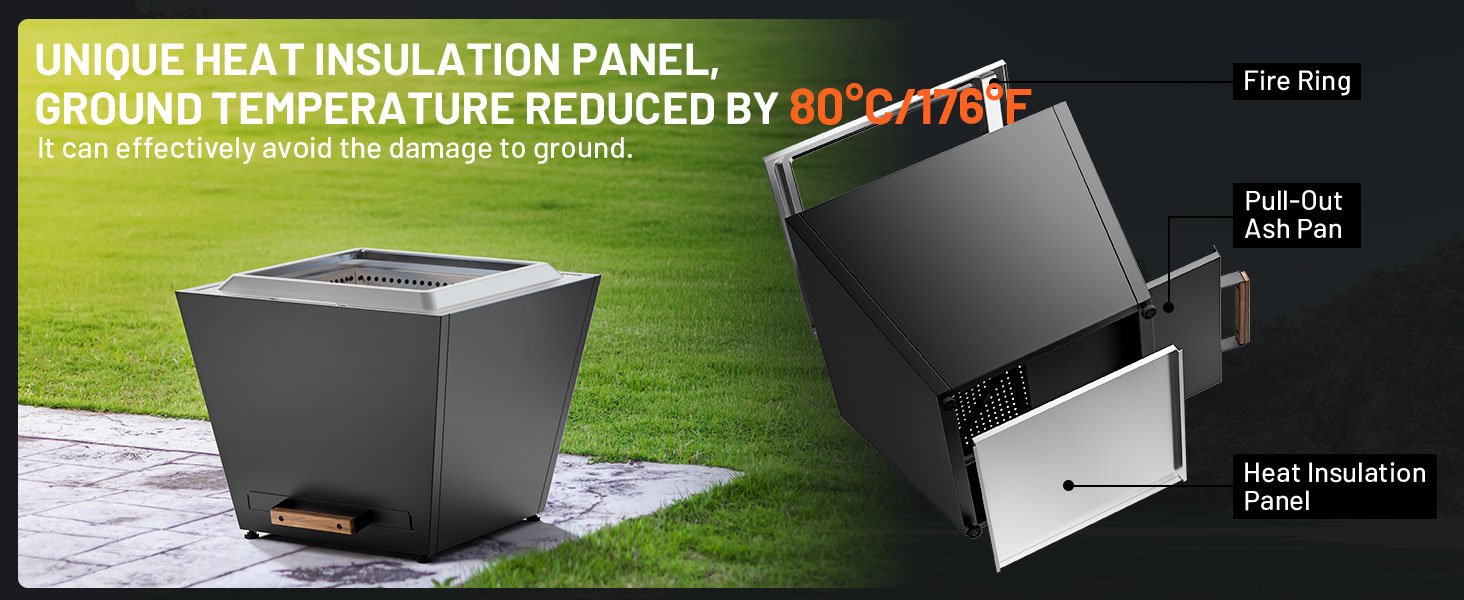 Easy to Clean: Innovative pull-out ash pan under wood burning fireplaces, makes you easily pull the ash pan out of the fire bowl to remove accumulated ash, without interrupting the fun of outdoor activities. It is more convenient and safer than the traditional ash pan, which can only pour out the ash by turning the entire product over completely after the entire stove is extinguished