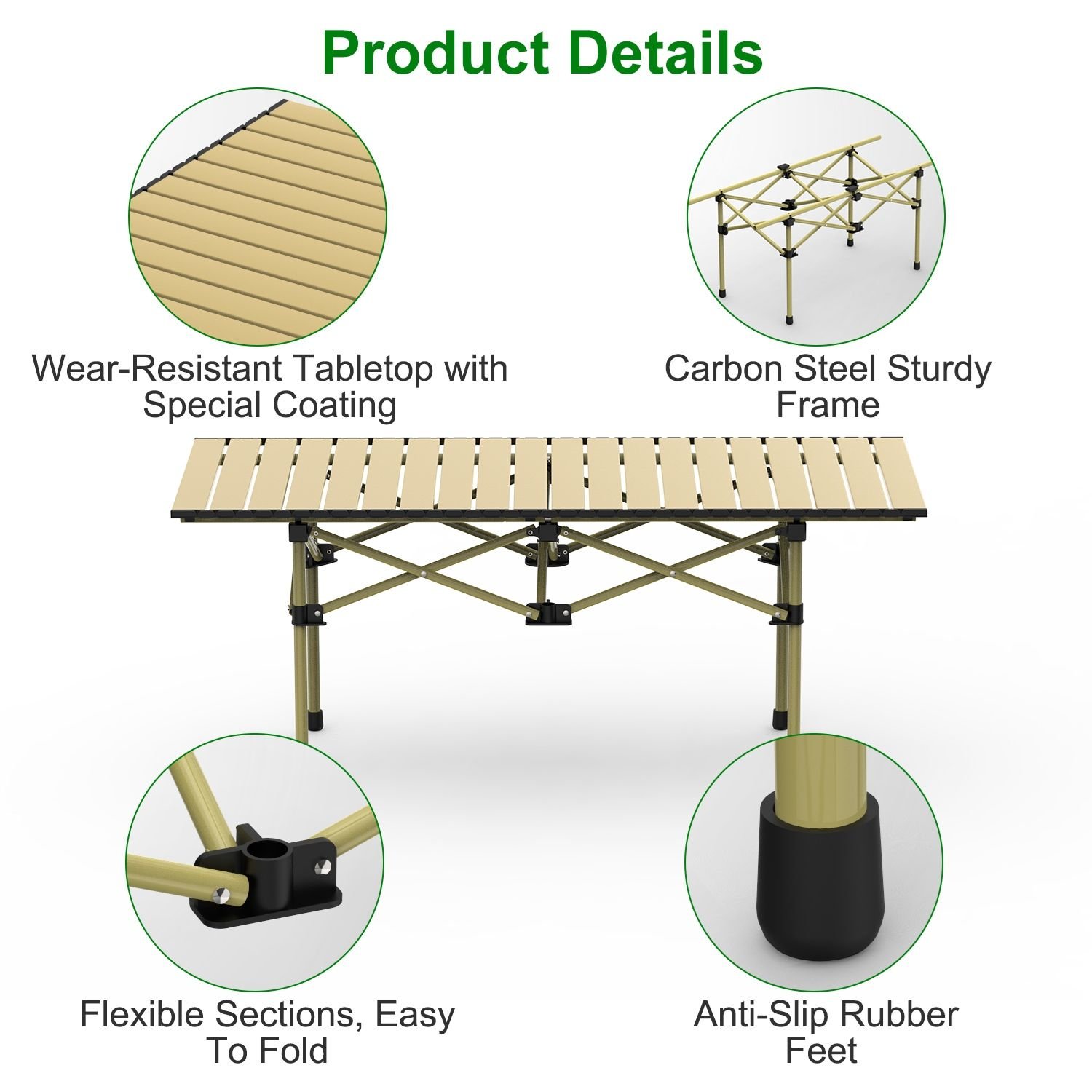 Sturdy Construction: Compared to other metal desk, our tabletop and frame are constructed of upgraded carbon steel with anti-slip rubber pad feet, this roll-up camping table delivers lighter weight while still remains excellent rust-resistance, heat-resistance, stability and durability, can withstand up to 44lbs(S)/66lbs(L) weight capacity.