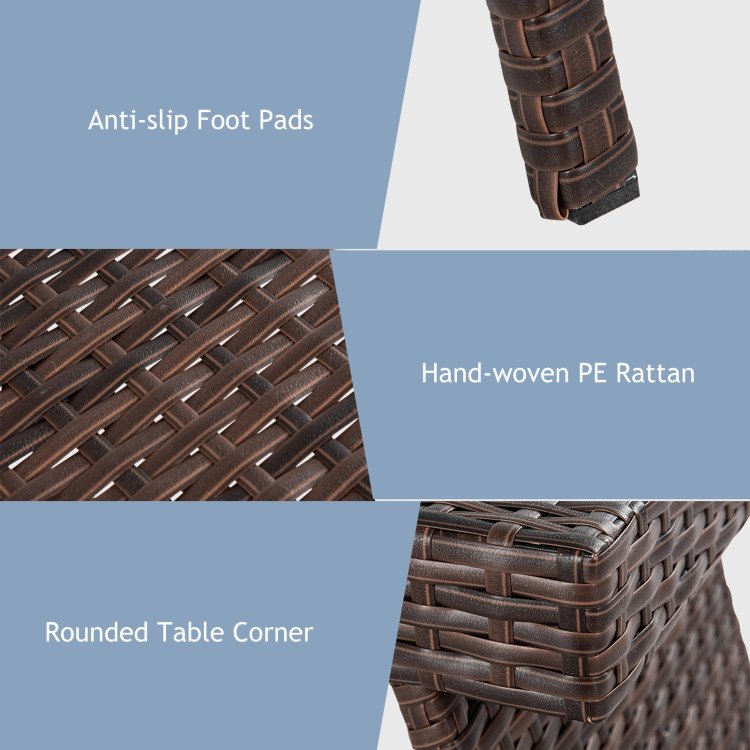 High quality and brand newEnvironmental protection and healthMade of PE rattan material; durable and weather-resistantGood air permeability; suitable for summer useContemporary design and ergonomic comfortStylish and simple design; suitable for various placesWithstand UV rays without fading.With the feature of folding ; portable and easy to storageTable top is wide enough for your bottles; cups and magazinesEasy to cleanNo assembly requirement